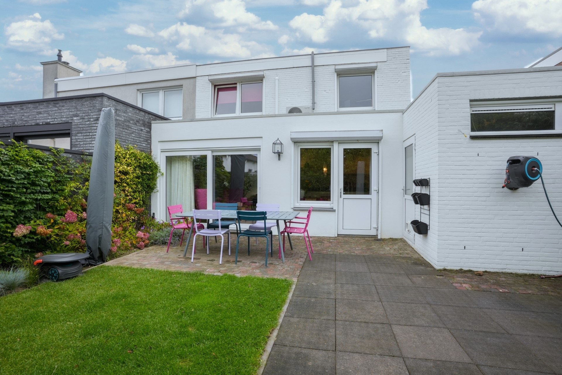 Vanuit de woon-/eetkamer, de keuken en de berging/wasruimte is de achtertuin te bereiken, met een uitstekende zonligging en genoeg ruimte om lekker buiten te zitten. Het gazon is een fijne speelplek voor de kinderen, en de gevarieerde beplanting zorgt voor een tuin met een gezellige sfeer. Zo zie je onder andere hortensia’s en een grote vlinderstruik met mooie bloemen. Links in de tuin zie je meerdere bergingen met dubbele deuren, voor het tuingereedschap en andere spullen. En als je na de bezichtiging naar de oprit loopt, dan zie je de voortuin met beplanting. Dit is een fijn huis voor een gezin, met lekker veel groen in de tuin en verrassend veel ruimte…