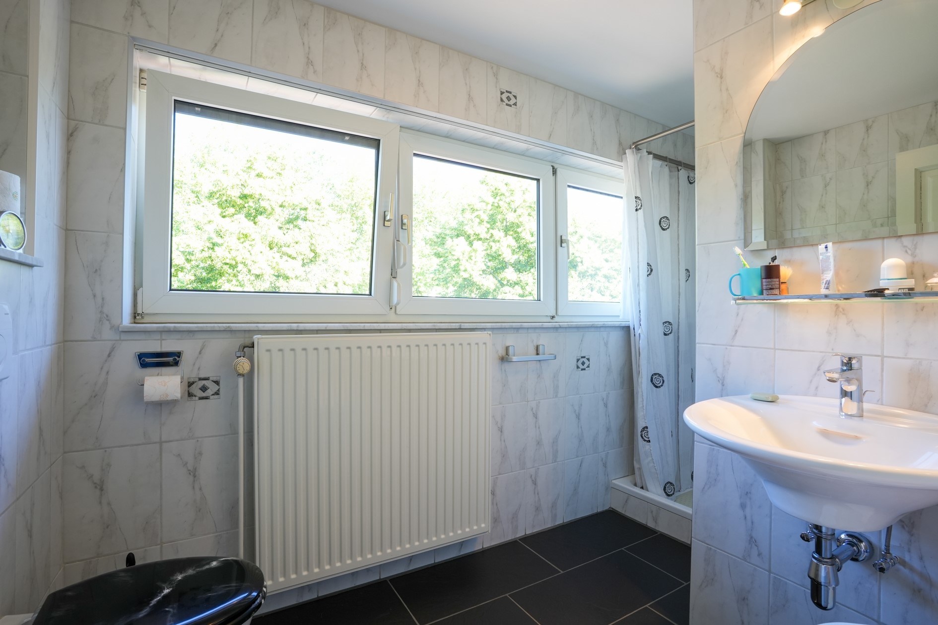 De badkamer (ca. 4.5 m²), met maar liefst drie ramen in de voorgevel, is ingedeeld met een douche, wandcloset en een wastafel. Het marmermotief van de wandtegels past goed bij de donkere vloertegels.