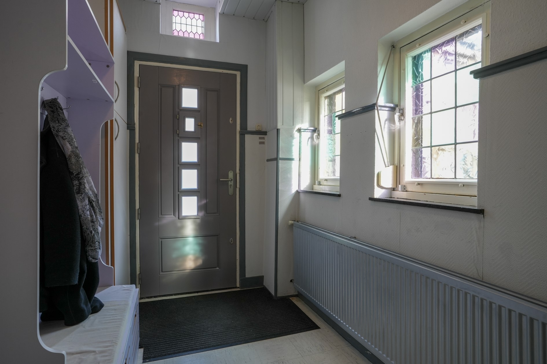 In de lange hal zie je de meterkast, twee kleurrijke glas-in loodramen en de prachtige bordestrap naar de eerste verdieping. Dankzij het hoge plafond oogt de hal heel ruimtelijk en de paneeldeuren, met een grijs geschilderd kozijn, zorgen voor een aangename sfeer. Achter een van de paneeldeuren is de toiletruimte met een glas-in loodraam en een hoge stortbak.