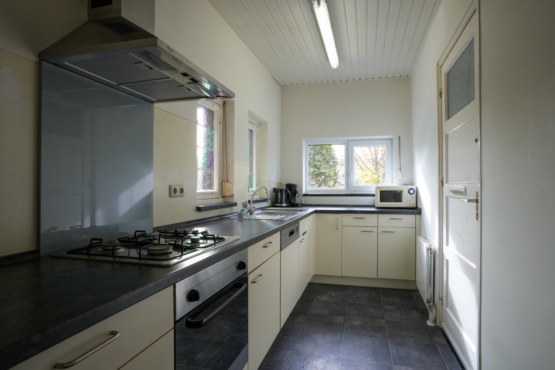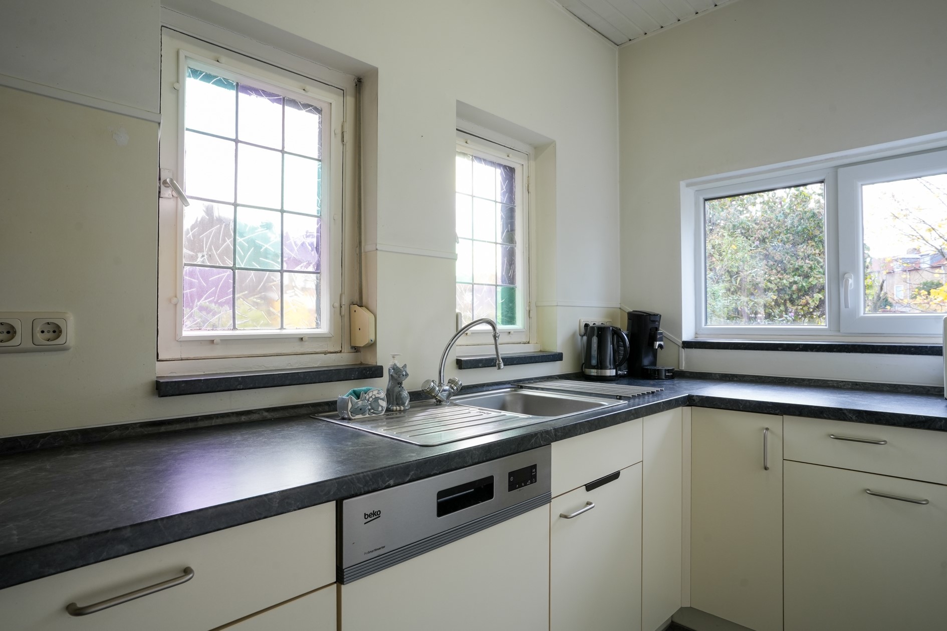 In de keuken staat een lichte hoekopstelling (2015) met een antracietkleurig aanrechtblad, voorzien van diverse inbouwapparatuur: een gaskookplaat, afzuigkap, oven, vaatwasser (vernieuwd) en een koelkast met vriesvak. Ook hier zijn de kleurrijke glas-in loodramen behouden en aan de achterzijde zorgen twee ramen voor mooi uitzicht naar de tuin.