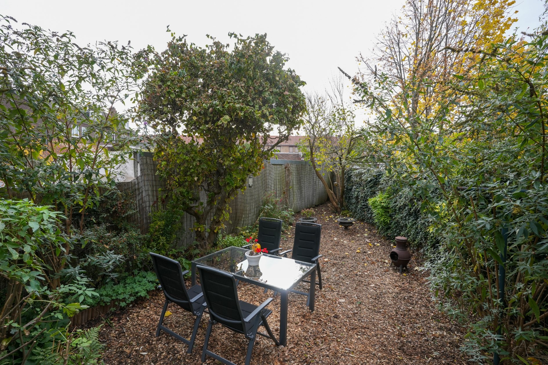 Via de schuifpui is de verrassend ruime tuin te bereiken. De ligging op het zuidwesten zorgt voor veel zon en de aanwezige beplanting biedt tevens een fijne plek in de schaduw. Een groot pluspunt is de eigen achterom, aan de linkerzijde van de woning. Zo kun je de fiets altijd op eigen terrein neerzetten. Terwijl je door de tuin loopt zie je veel verschillende planten, boomschors en erfafscheiding van riet en klimop.