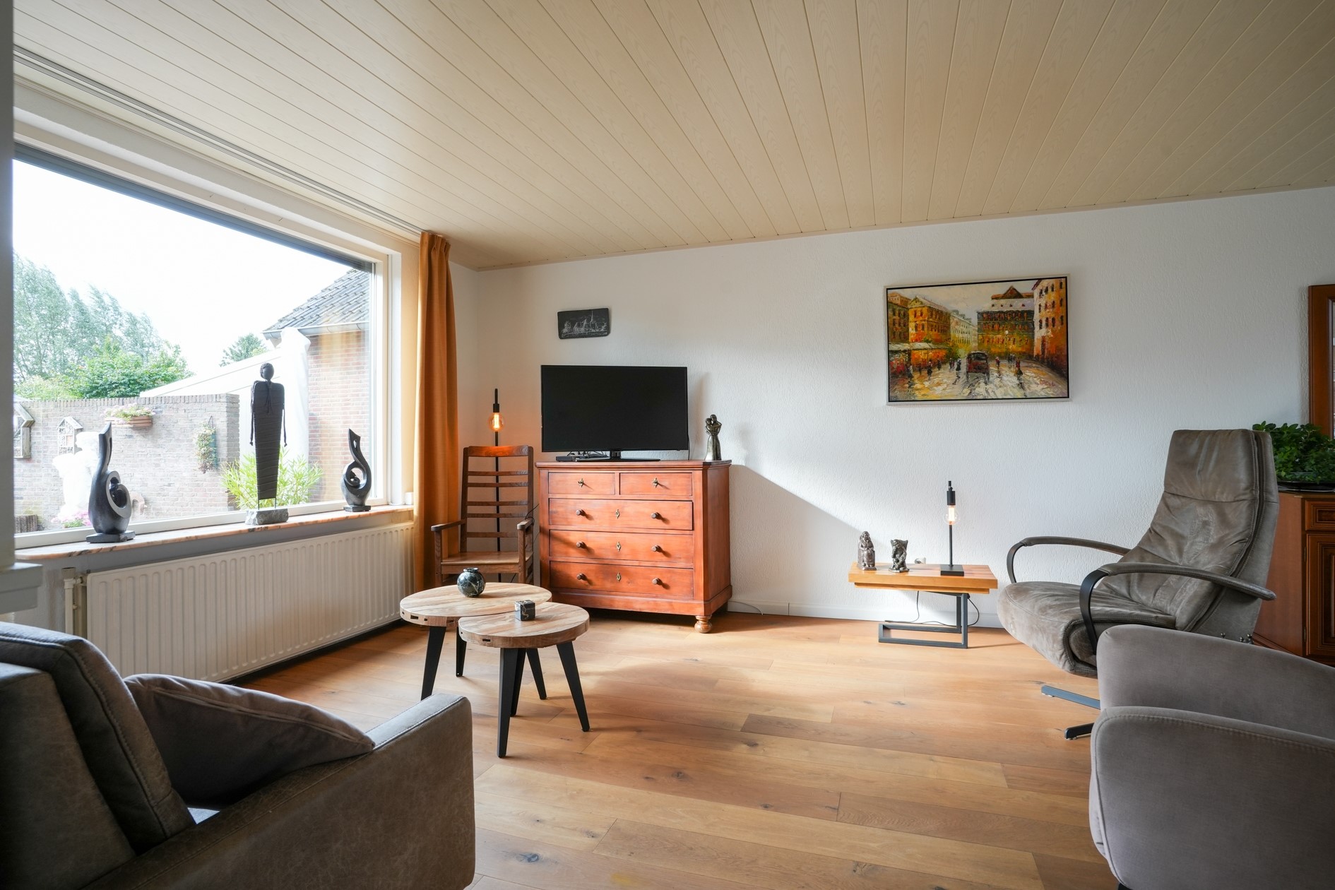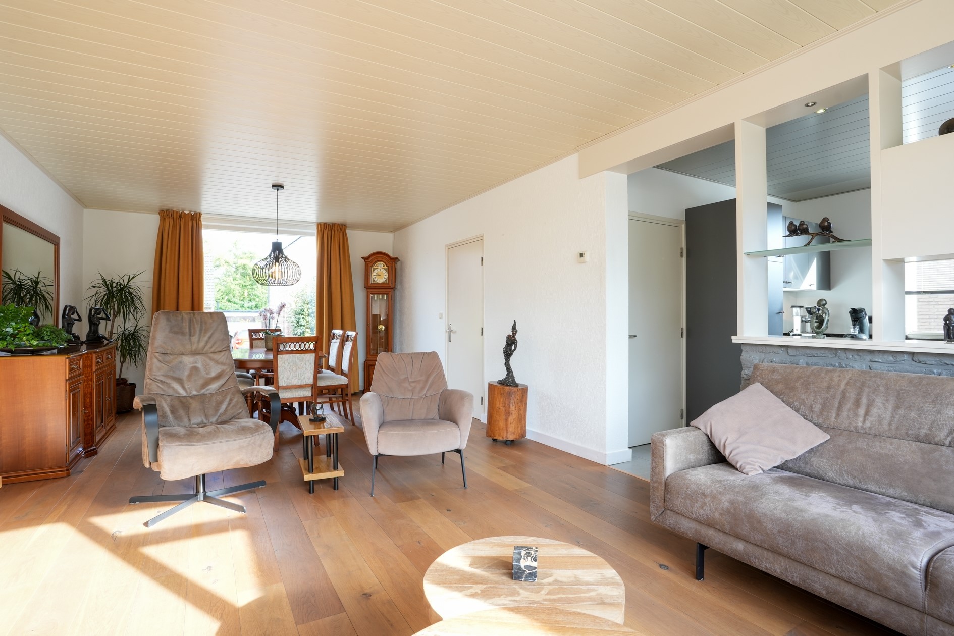 Grote ramen aan de voor- en achterzijde zorgen voor veel lichtinval in de circa 32 m2 grote woonkamer. De eiken vloer zorgt voor een aangename sfeer en de halfopen verbinding met de keuken is voor een speels element, die tevens beide ruimtes optisch groter maakt. Nu is de woonkamer ingedeeld met het eetgedeelte aan de voorzijde, en het zitgedeelte met uitzicht naar de achtertuin.