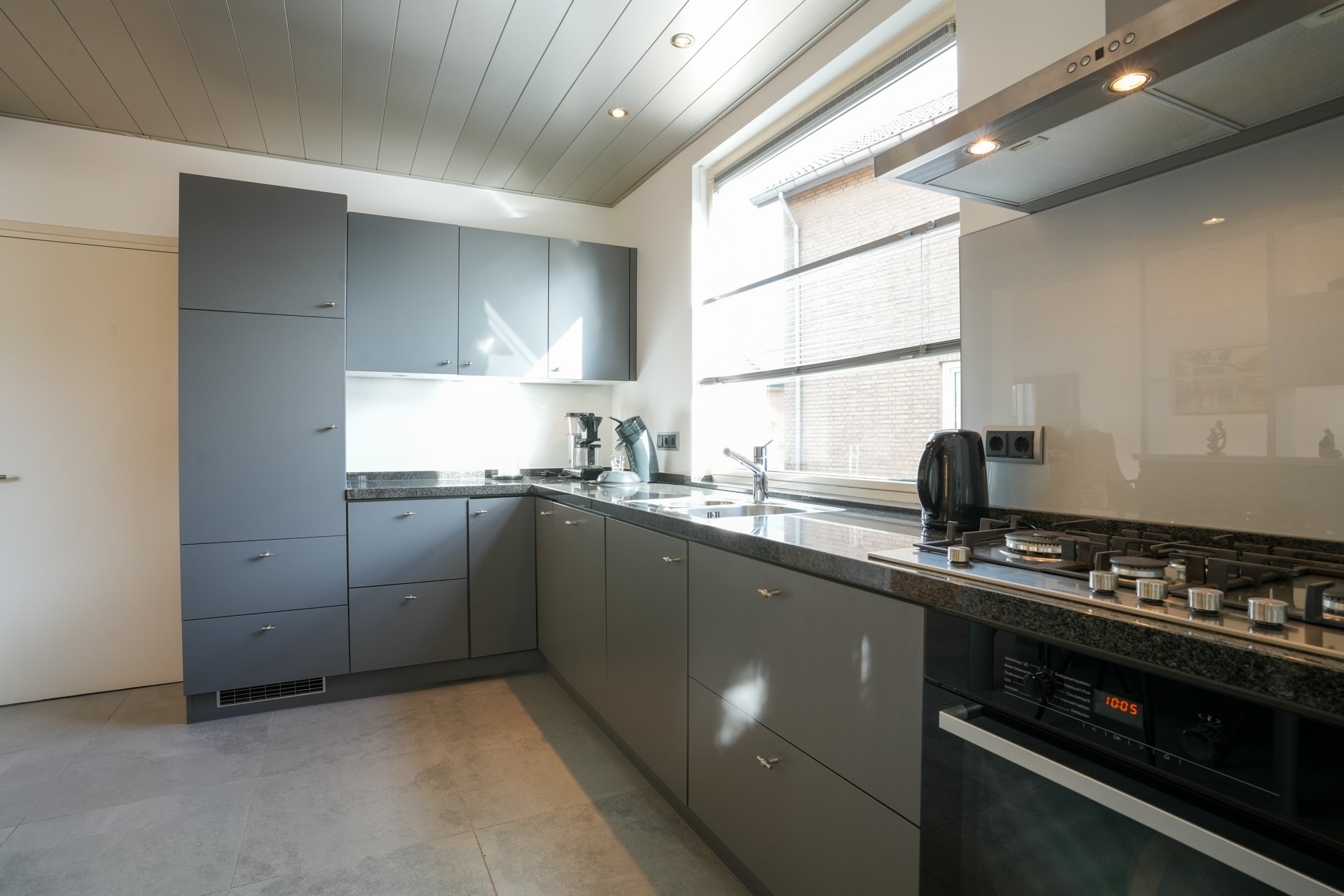 Vanuit de woonkamer en hal is de eetkeuken (circa 10.7 m2) te bereiken, met een groot raam bij het spoelgedeelte. De grijze hoekopstelling heeft een aanrechtblad van stijlvol graniet en alle benodigde apparatuur is ingebouwd: een 5-pits gaskookplaat, afzuigkap, oven, vaatwasser en een koelkast.