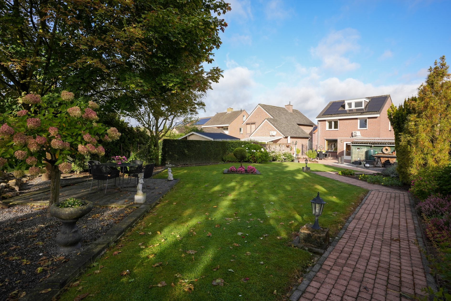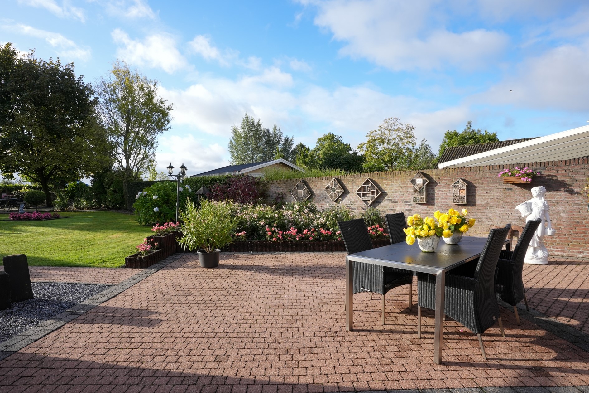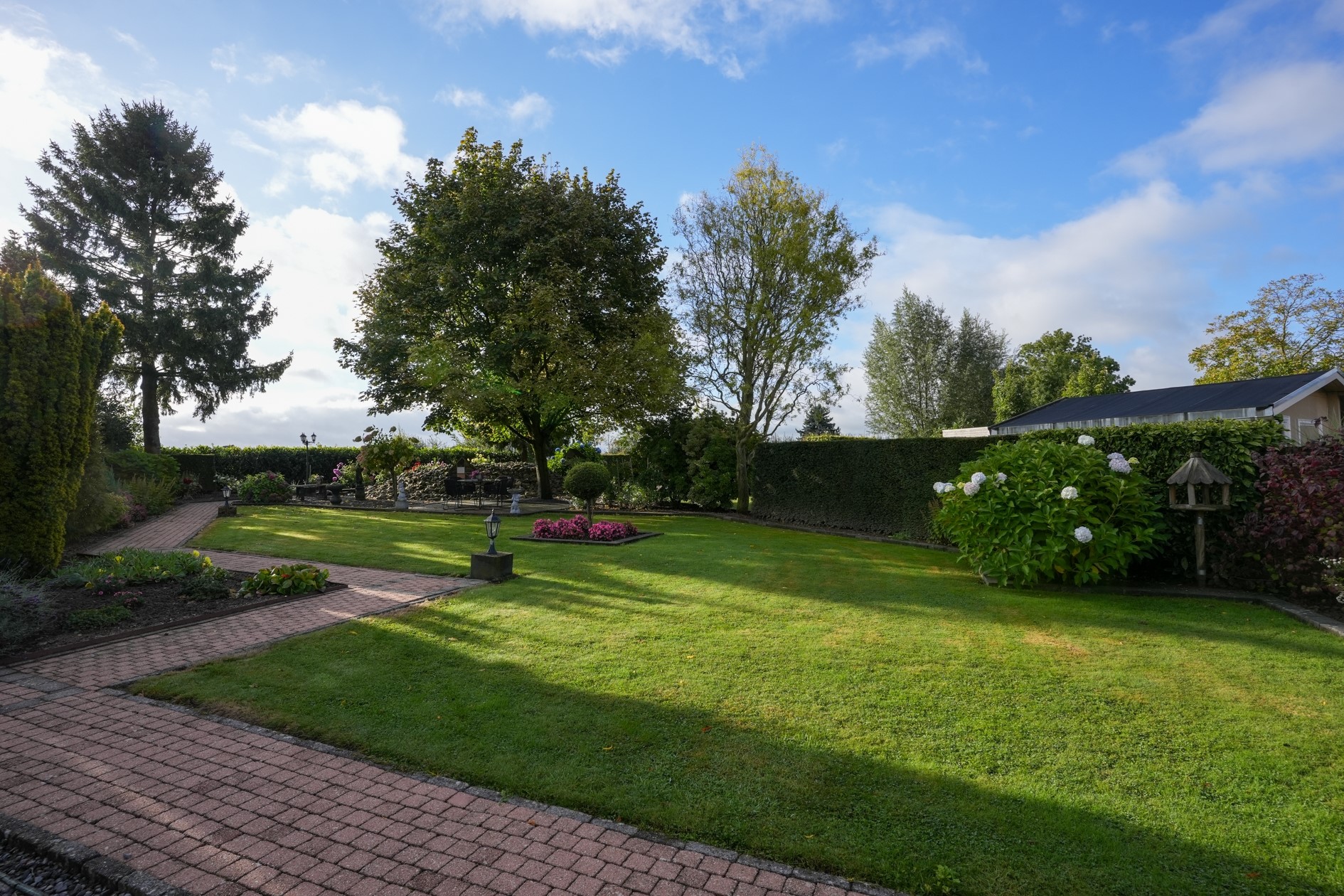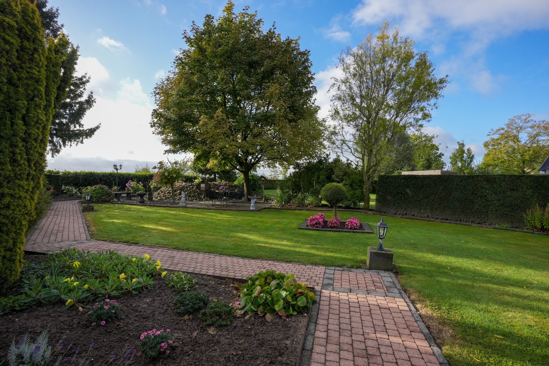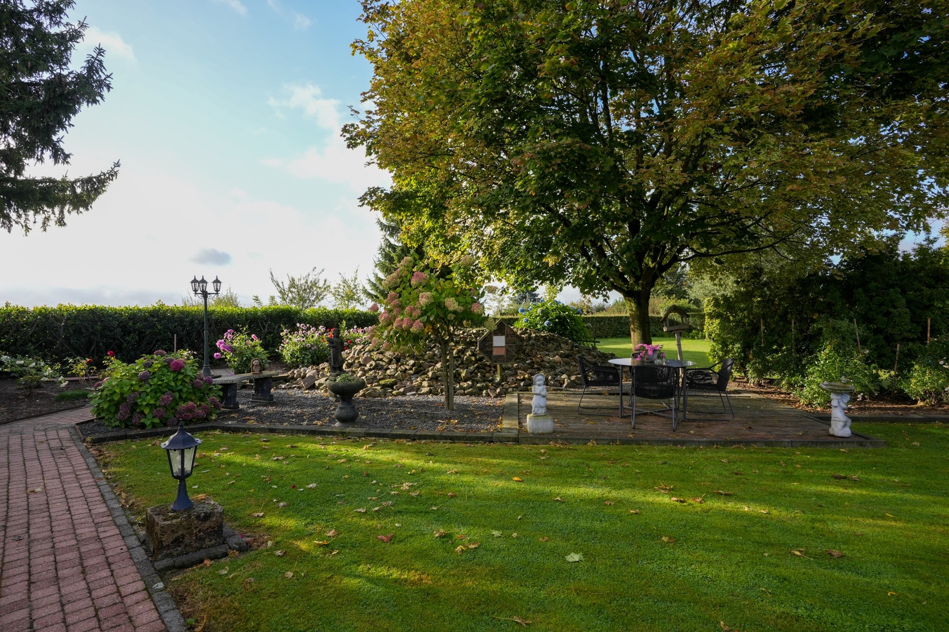 Openslaande deuren in de tuinkamer geven toegang tot de zeer diepe, mooi aangelegde tuin op het zuidoosten. Het grote terras biedt volop zon en iets verder in de tuin is een tweede terras, waar zowel zon als schaduw te vinden is. Diagonale lijnen maken de tuin optisch breder en er is veel groen in de tuin, van een goed onderhouden gazon tot hoge bomen en mooi aangelegde borders. Aan de achterzijde grenst de tuin aan een weiland, waar koeien van een nabijgelegen boerderij kunnen grazen. Dit is een fantastische tuin voor mensen met groene vingers en voor een gezin, want kinderen hebben alle ruimte om buiten te spelen.