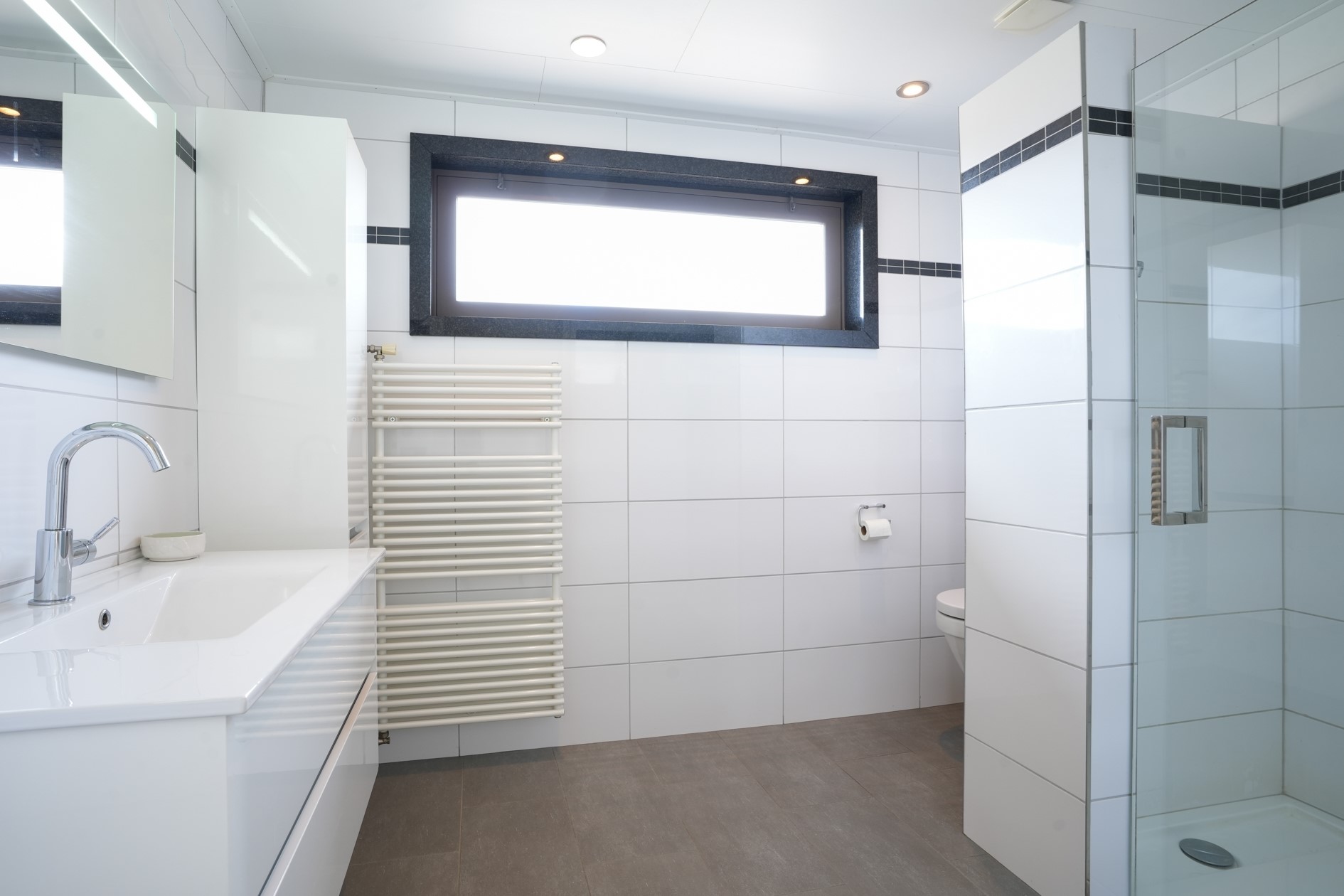 Naast de derde slaapkamer is de in 2020 vernieuwde badkamer met fraai tegelwerk en modern sanitair. Het raam zorgt voor veel lichtinval, en als het buiten donker is, zorgt de inbouwverlichting voor veel sfeer. De inloopdouche is voorzien van een regendouche en een handdouche, het wastafelmeubel biedt veel bergruimte en in een nis is het tweede toilet.