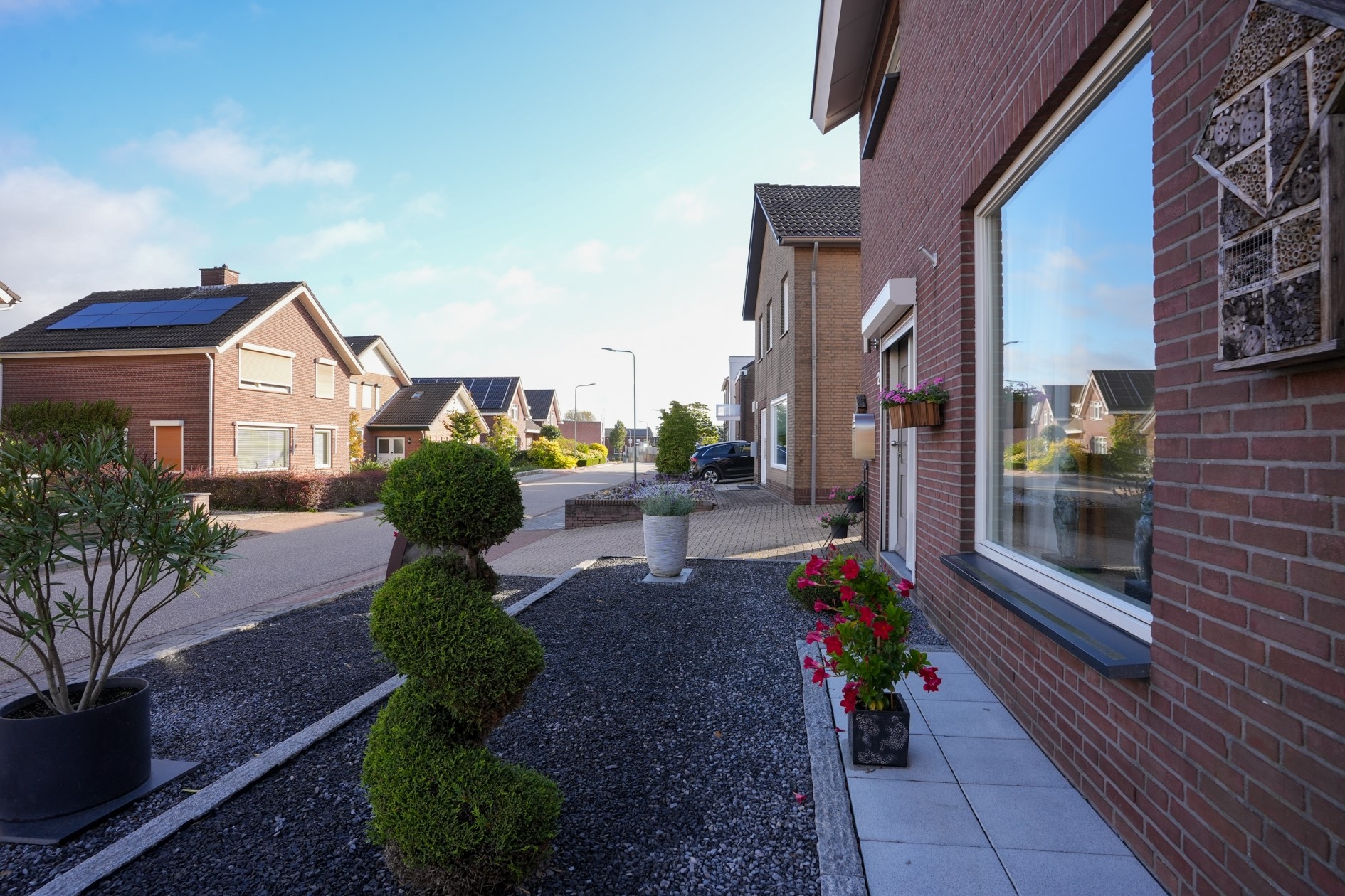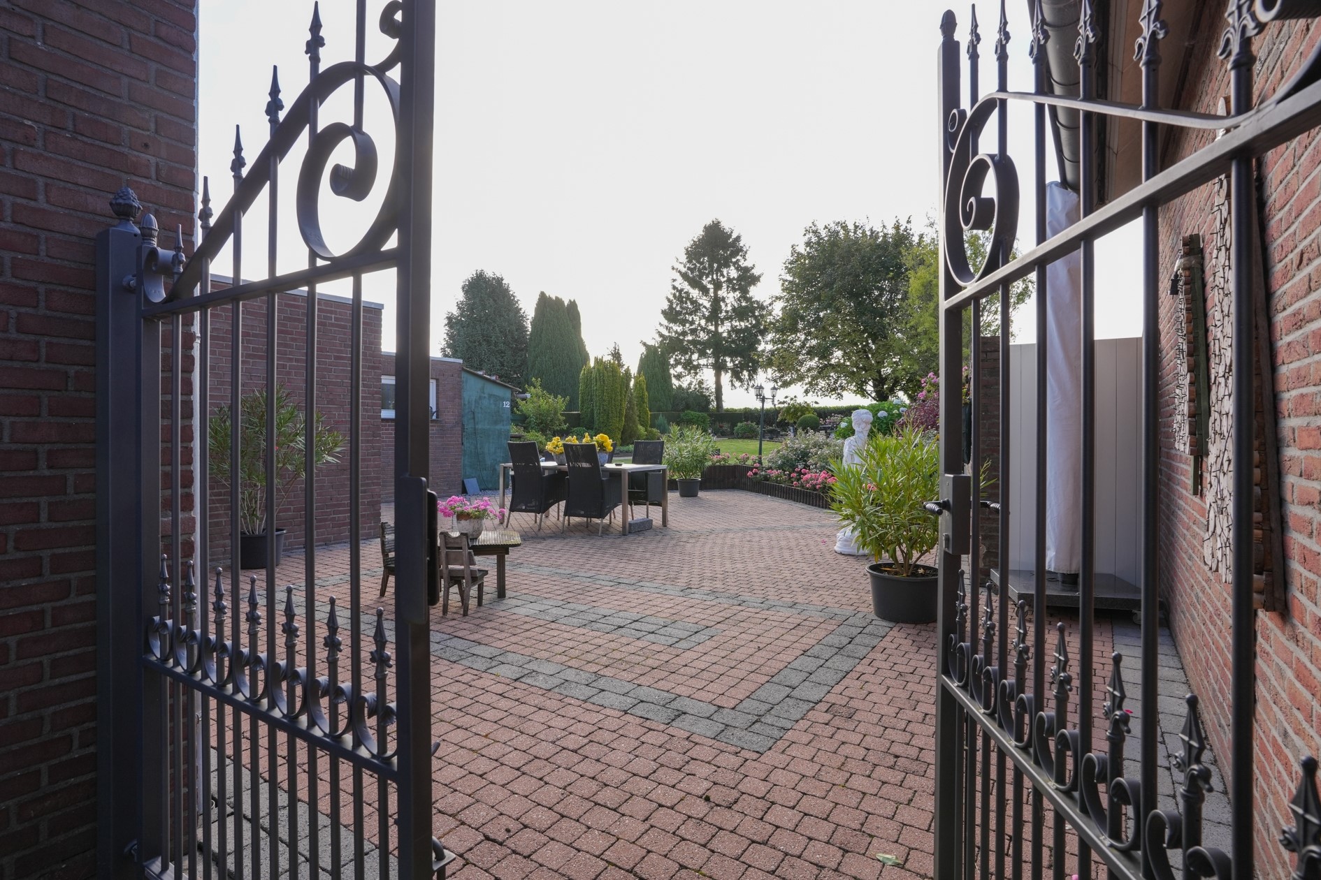 Aan de rechterzijde is een brede achterom, met een dubbele poort naar een oprit. De voortuin, verdeeld over twee niveaus, is heel onderhoudsvriendelijk aangelegd en aan de linkerkant van de woning is een tweede oprit, richting de garage.