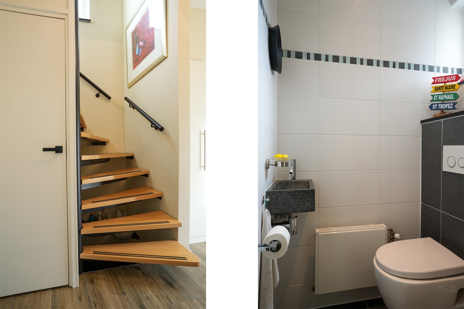Achter de fraaie voordeur is de ruime hal, met een houtlook tegelvloer en strak stucwerk op de wanden en het plafond. Rechts in de hal zijn o.a. een handige muurkast, de luxe toiletruimte met fonteintje, de fraaie trap naar de eerste verdieping en de trap naar het souterrain.