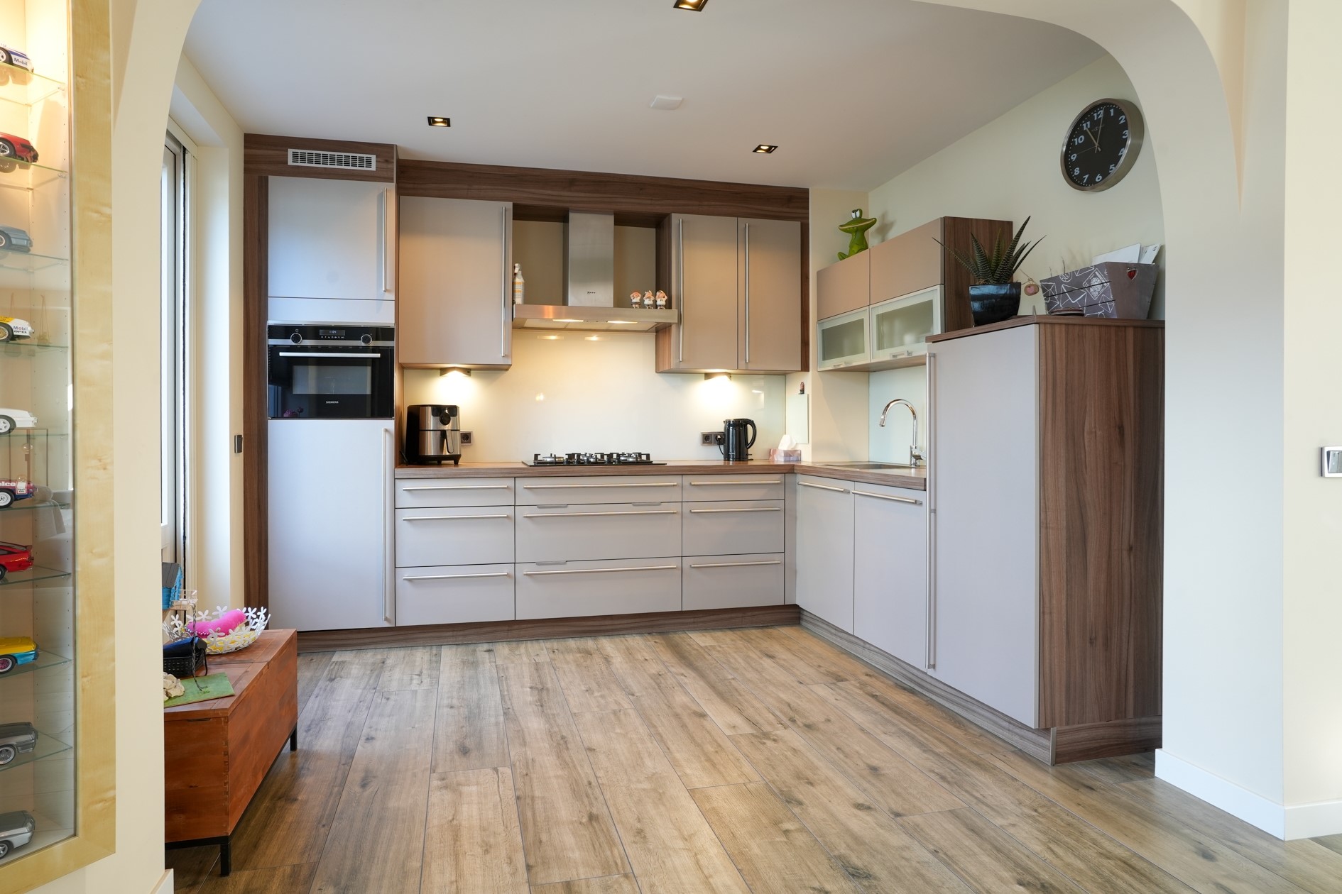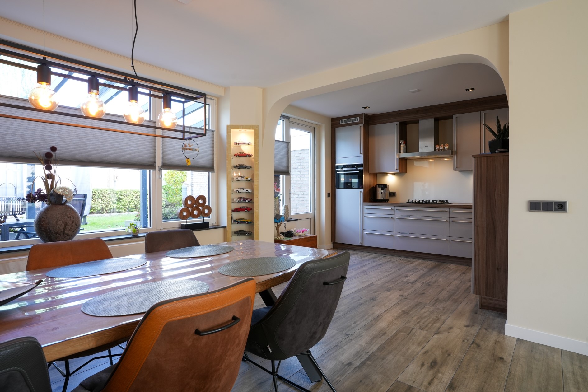 Bij het eetgedeelte is een brede doorgang naar de keuken (circa 9.4 m2), waar in 2010 een moderne hoekopstelling in een fraaie kleurstelling is geplaatst. Deze keuken biedt niet alleen veel bergruimte, maar ook alle benodigde apparatuur is ingebouwd: een 5-pits gaskookplaat, afzuigkap, combi-oven, koelkast en een vaatwasser.