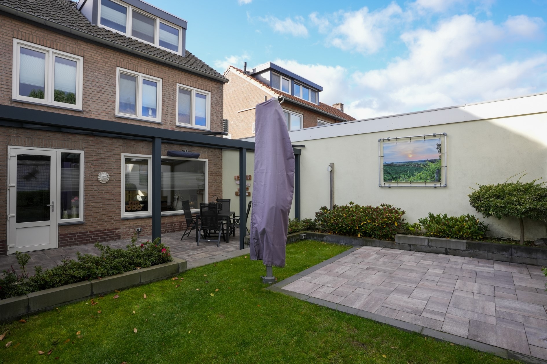 Vanuit de keuken is de fraai aangelegde tuin te bereiken. Blikvanger is het overdekte terras (2022) van maar liefst 23 m2 met een elektrisch bedienbaar zonnescherm, inbouwverlichting en terrasverwarming. De rest van de tuin is ingedeeld met gras, beplanting en een tweede terras. In het verlengde van de garage staat een stalen berging, die wordt gebruikt voor het tuingereedschap. De voortuin is ingedeeld over twee niveaus, met beplanting die weinig onderhoud nodig heeft.