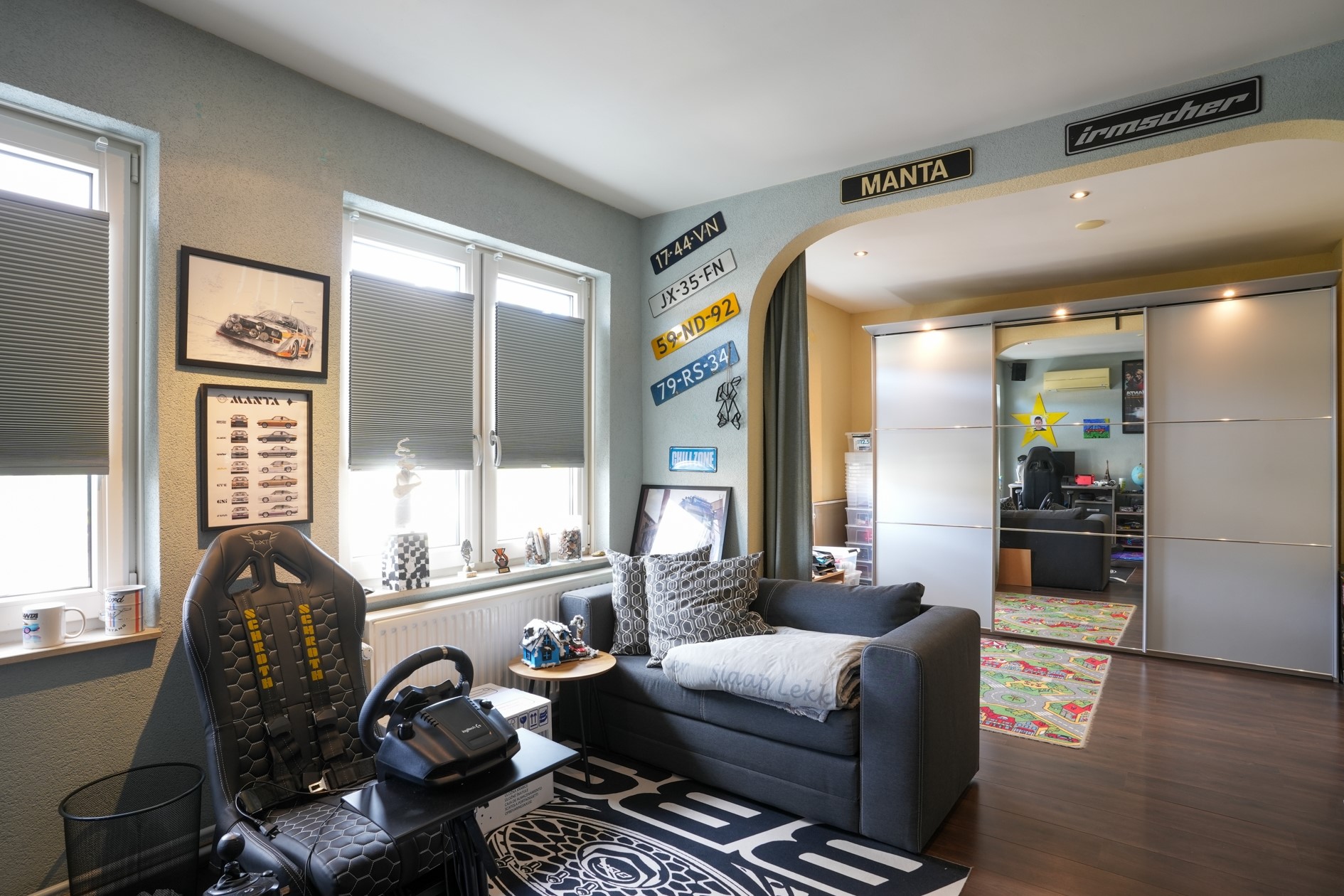Aan de achterzijde zijn twee slaapkamers samengevoegd tot een zeer ruime kinderkamer (circa 24.6 m2), waarvan een deel in gebruik is als kleedruimte. De slaapkamer aan de voorzijde (circa 13.9 m2) is eveneens in gebruik als kinderkamer van ruim formaat.
