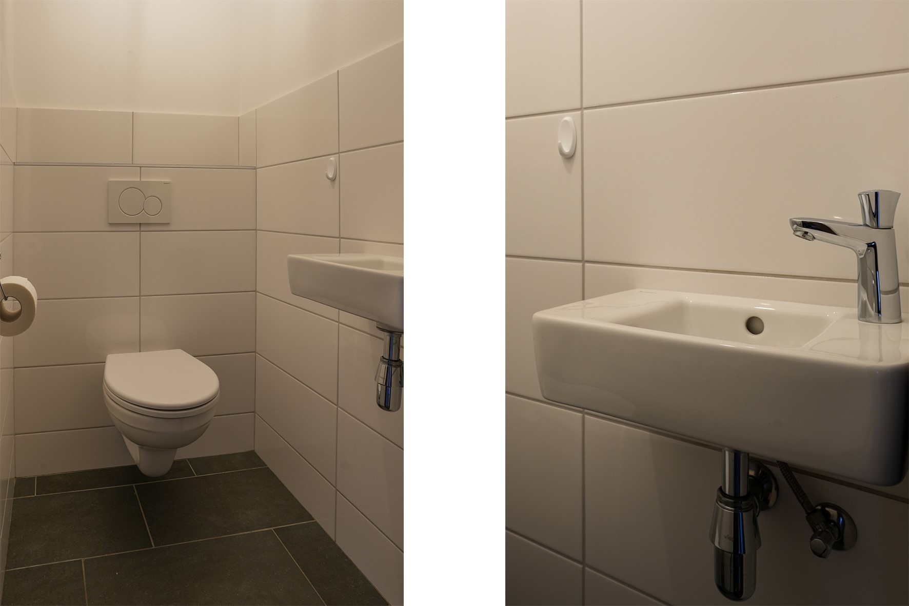 De lichtkleurige, eenvoudige badkamer is ingedeeld met een ligbad/douche, een toilet en een wastafel. Boven de wastafel hangt een spiegelkast en op de wand zie je een schakelaar van de in 2024 geplaatste ventilatieunit.