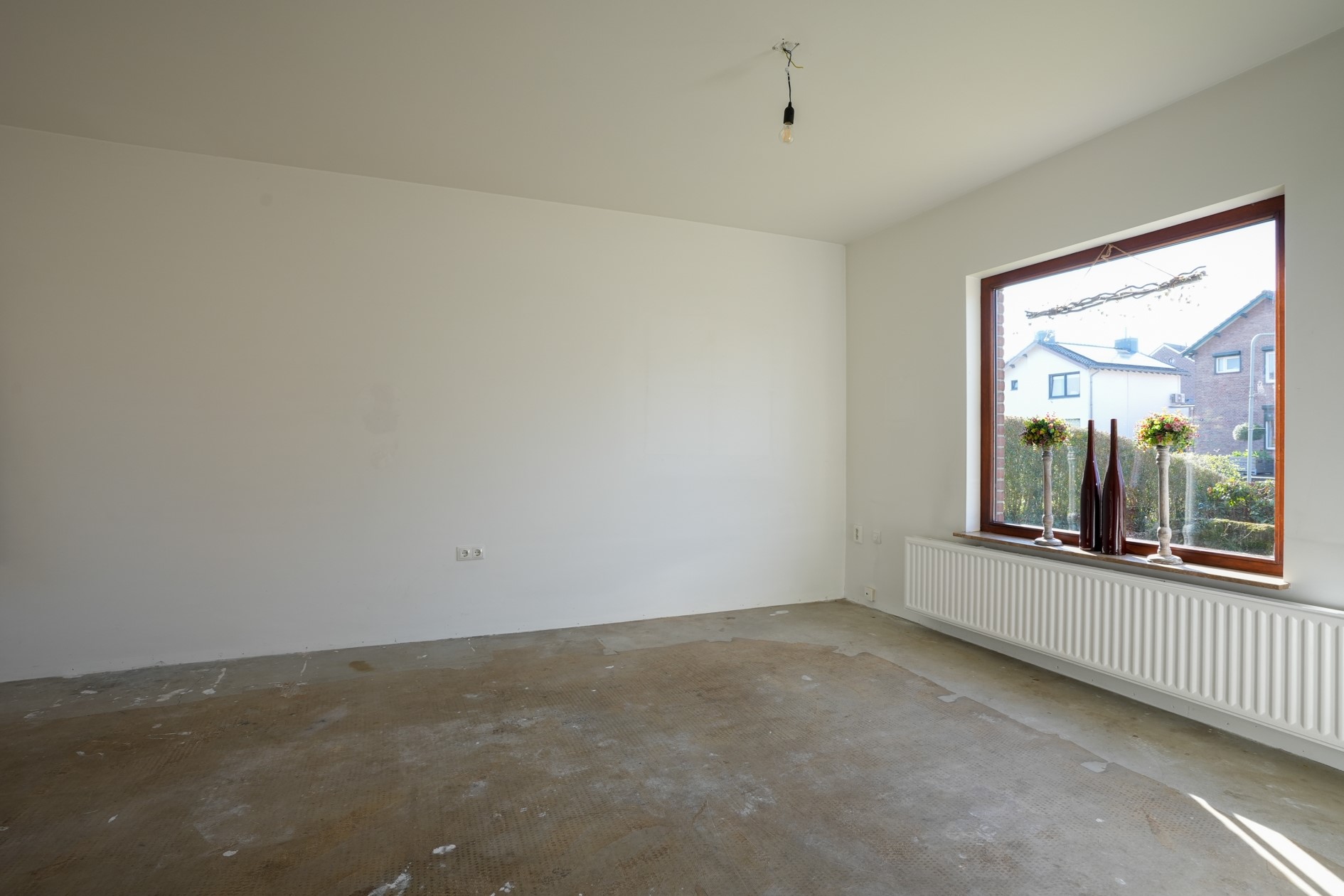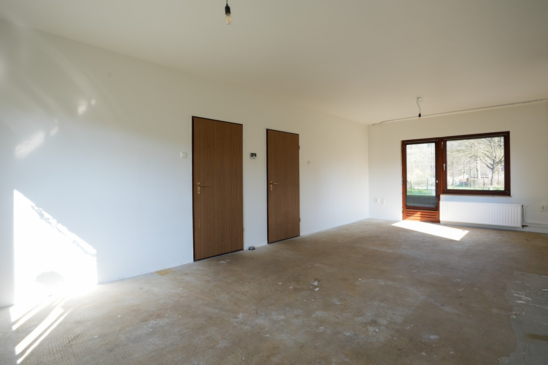 Vanuit de hal is er toegang tot de woonkamer, keuken, garage/berging, en de tuin. De woonkamer, met lichtinval vanaf drie kanten, heeft een oppervlakte van circa 31.4 m2. Het stucwerk is in 2019 vernieuwd en aan de achterzijde is een deur naar het terras.